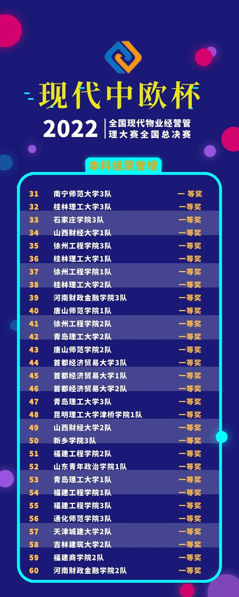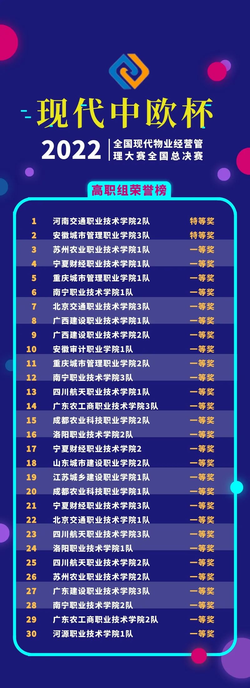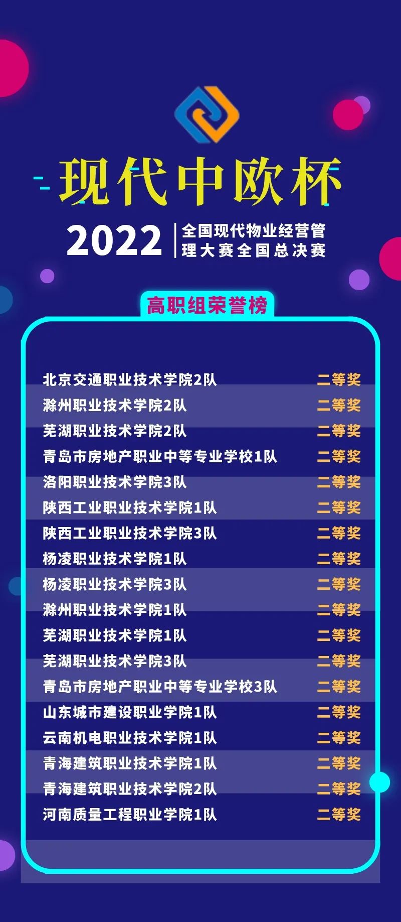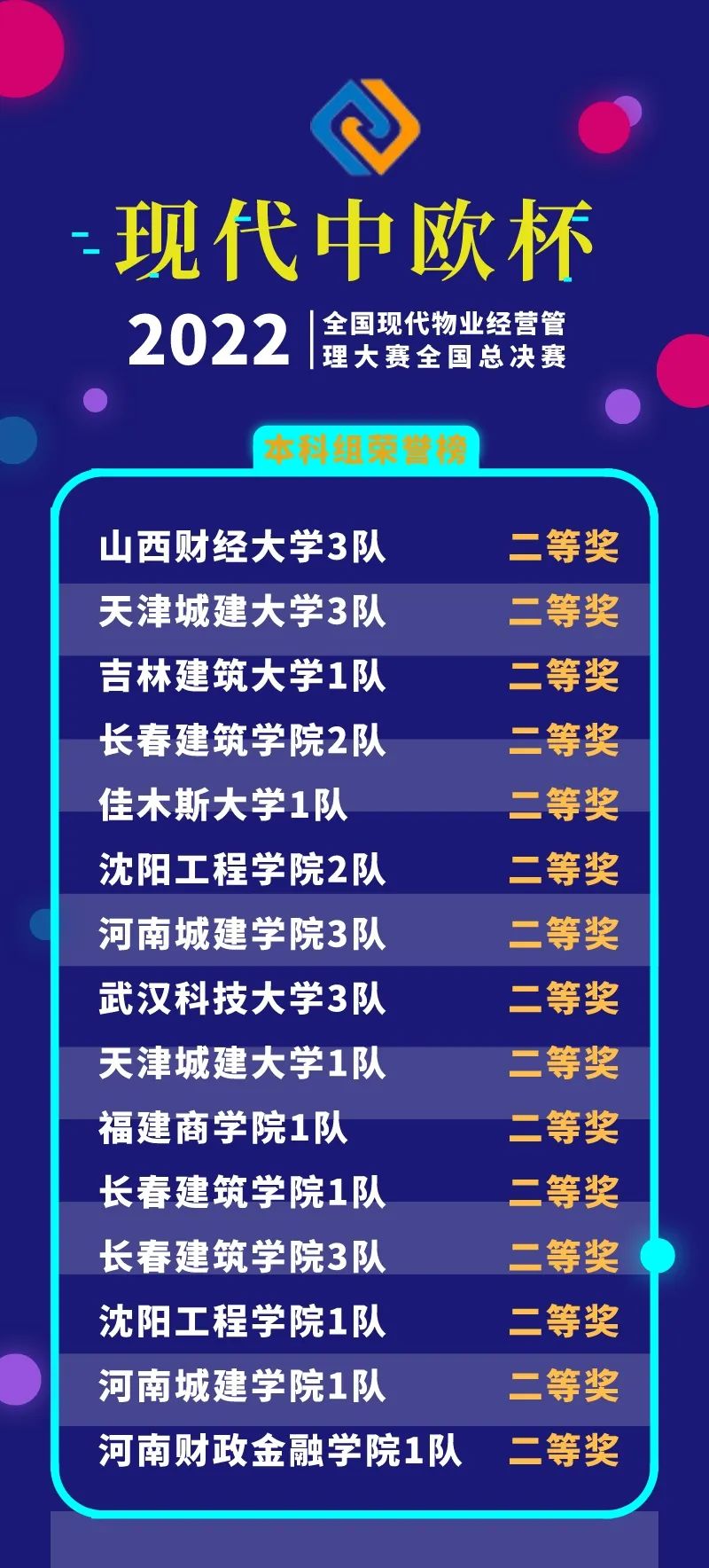 經(jīng)過線上競賽的激烈比拼,2022年“現(xiàn)代中歐杯”全國現(xiàn)代物業(yè)經(jīng)營管理大賽全國總決賽獲獎名單揭曉。
