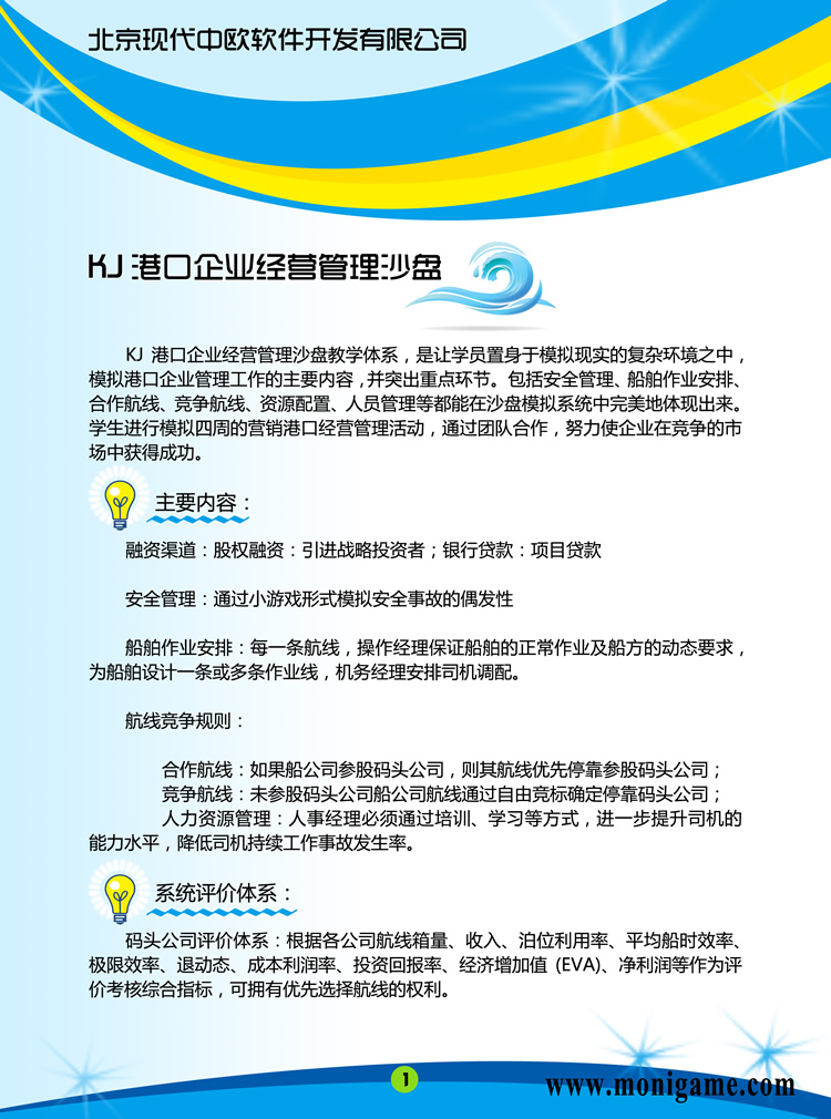 1、港口企業(yè)經(jīng)營管理沙盤以財務(wù)知識普及和港口決策能力訓(xùn)練為重點,全面提升學(xué)員港口管理決策能力和執(zhí)行能力;