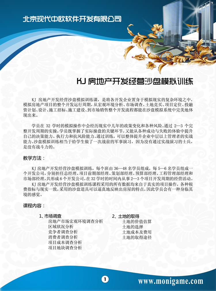 房地產(chǎn)企業(yè)開(kāi)發(fā)經(jīng)營(yíng)沙盤(pán)模擬訓(xùn)練系統(tǒng),是將各開(kāi)發(fā)企業(yè)置身于模擬現(xiàn)實(shí)的復(fù)雜環(huán)境之中,模擬房地產(chǎn)項(xiàng)目的整個(gè)開(kāi)發(fā)運(yùn)行周期,從客觀環(huán)境分析、市場(chǎng)調(diào)查、土地競(jìng)買、項(xiàng)目定位、融資、設(shè)計(jì)、施工招標(biāo)、施工建設(shè)、到銷售整個(gè)開(kāi)發(fā)流程都能在沙盤(pán)模擬系統(tǒng)中完美地體現(xiàn)出來(lái)。